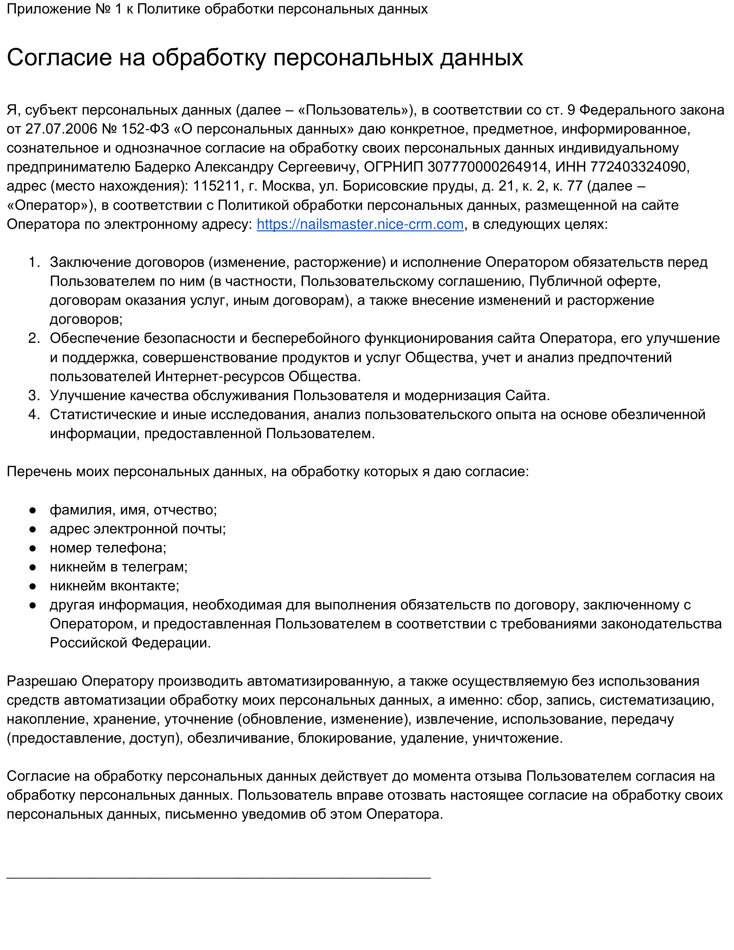 Мы используем файлы cookie. nailsmaster.nice-crm.com использует cookie для обеспечения функционирования веб-сайта, аналитики действий на веб-сайте и улучшения качества обслуживания. Для получения дополнительной информации Вы можете ознакомиться с Политикой Cookie. Если Вы не хотите, чтобы эти данные обрабатывались, отключите cookie в настройках браузера. Оставаясь на сайте Вы даете свое согласие на обработку персональных данных, с политикой обработки персональных данных можно ознакомиться по ссылке Политика обработки персональных данных.