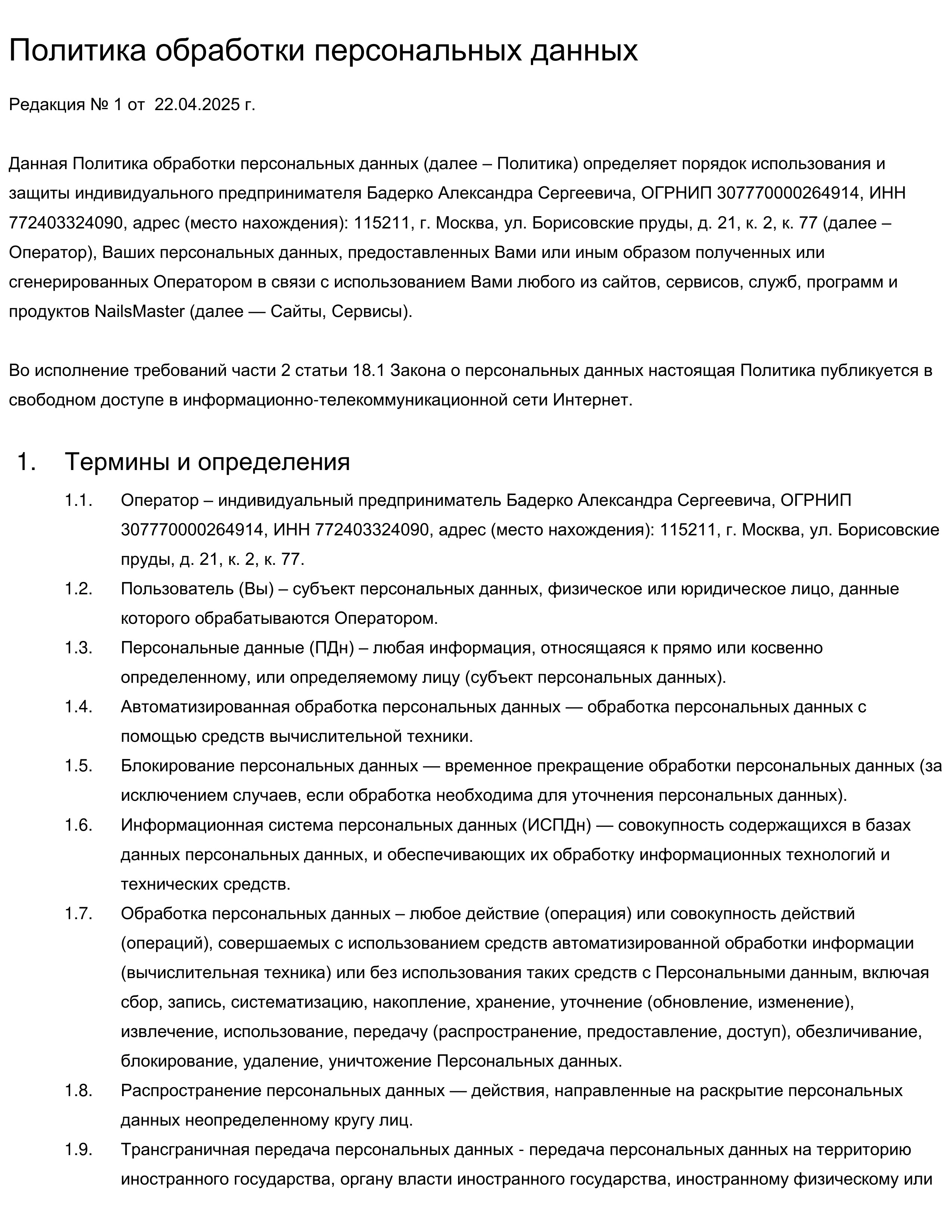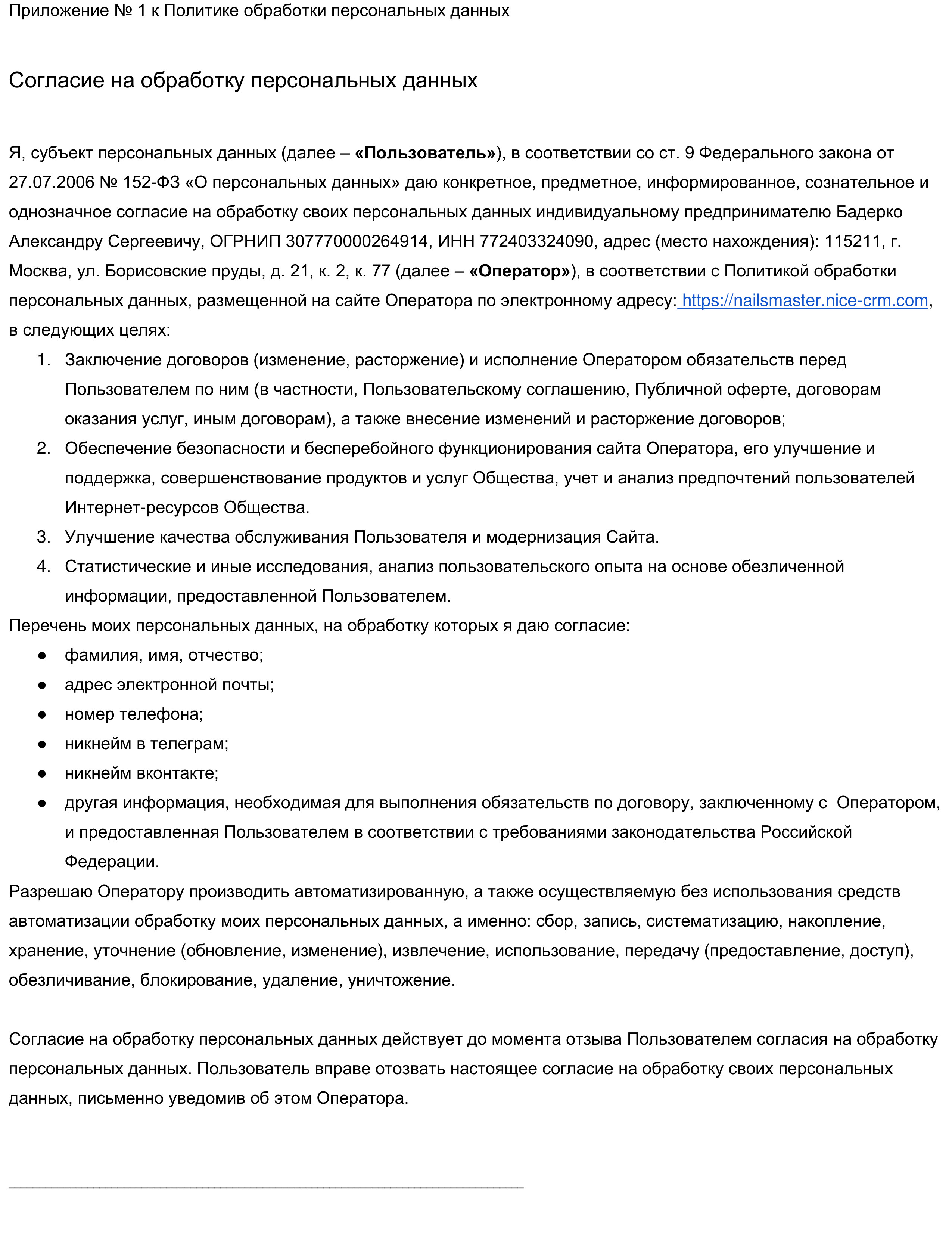 Мы используем файлы cookie. nailsmaster.nice-crm.com использует cookie для обеспечения функционирования веб-сайта, аналитики действий на веб-сайте и улучшения качества обслуживания. Для получения дополнительной информации Вы можете ознакомиться с Политикой Cookie. Если Вы не хотите, чтобы эти данные обрабатывались, отключите cookie в настройках браузера. Оставаясь на сайте Вы даете свое согласие на обработку персональных данных, с политикой обработки персональных данных можно ознакомиться по ссылке Политика обработки персональных данных.